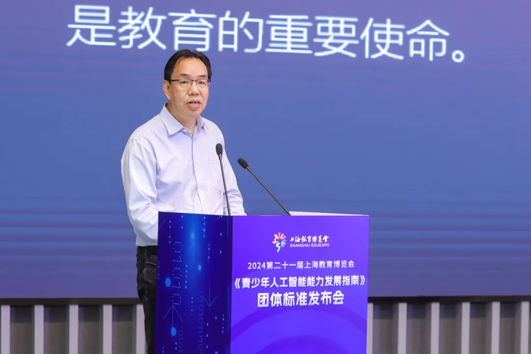 星空电竞(中国)机器人有限公司官网院长郑军奇,上海教育报刊总社副社长徐勇,上海市人工智能标准化技术委员会副秘书长、上海人工智能行业协会标准研究部部长陈曦分别上台致辞,对参与标准制定的所有高等院校、科研机构和企事业单位表示感谢,对团体标准的发布表示支持与祝贺,并对青少年人工智能教育的未来发展表示殷切的期望。
