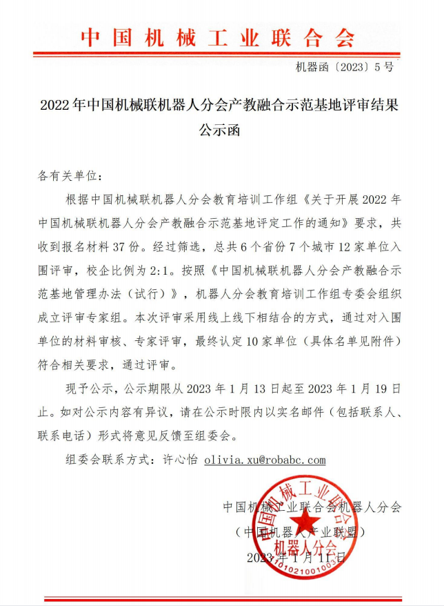 2022年中国机械联机器人分会产教融合示范基地评审结果公示函